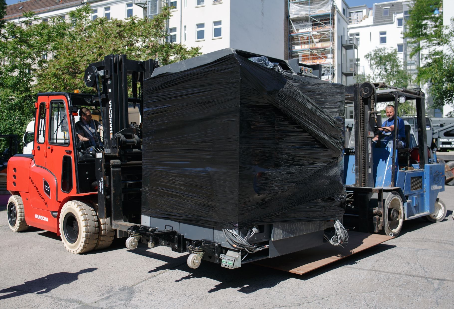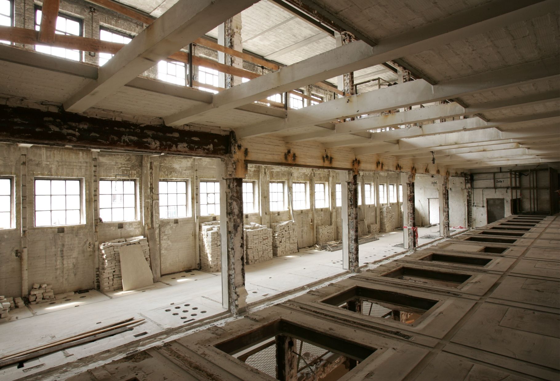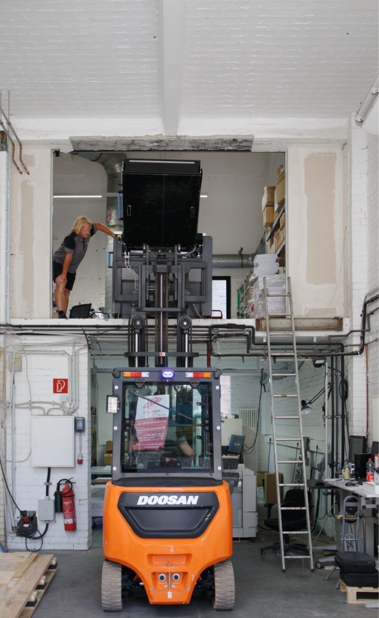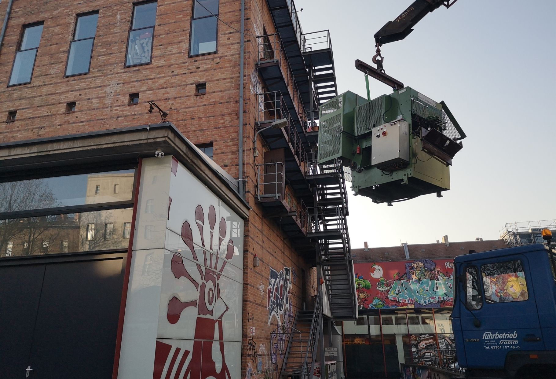 Natürlich bringt ein denkmalgeschütztes Gebäude auch Herausforderungen mit sich: Unsere großen Maschinen mussten mit viel Aufwand und Kreativität ins Haus gebracht werden. Dafür entschädigt uns ein ganz besonderer Ort: die „Warte“ – der ehemalige Kontrollraum im obersten Stockwerk. Heute nutzen wir ihn für Versammlungen und Feiern.